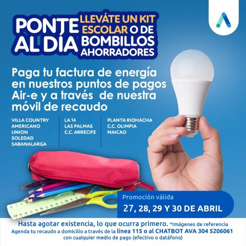 Con el fin de fomentar el uso eficiente de la energía, la empresa Air-e entregará a los clientes que paguen su factura en los puntos de pago Air-e y a través de recaudo a domicilio un kit de bombillos ahorradores o un kit escolar.